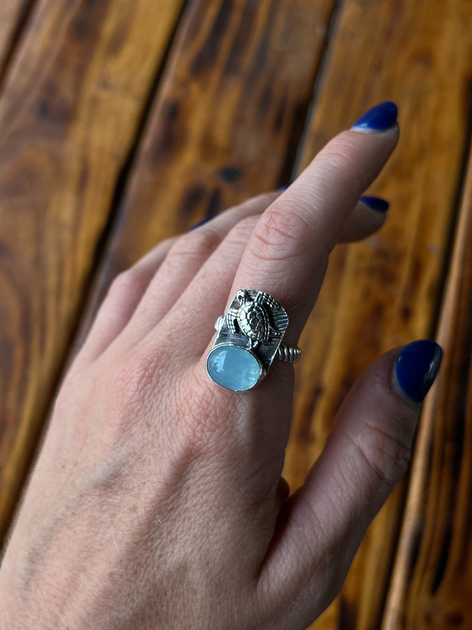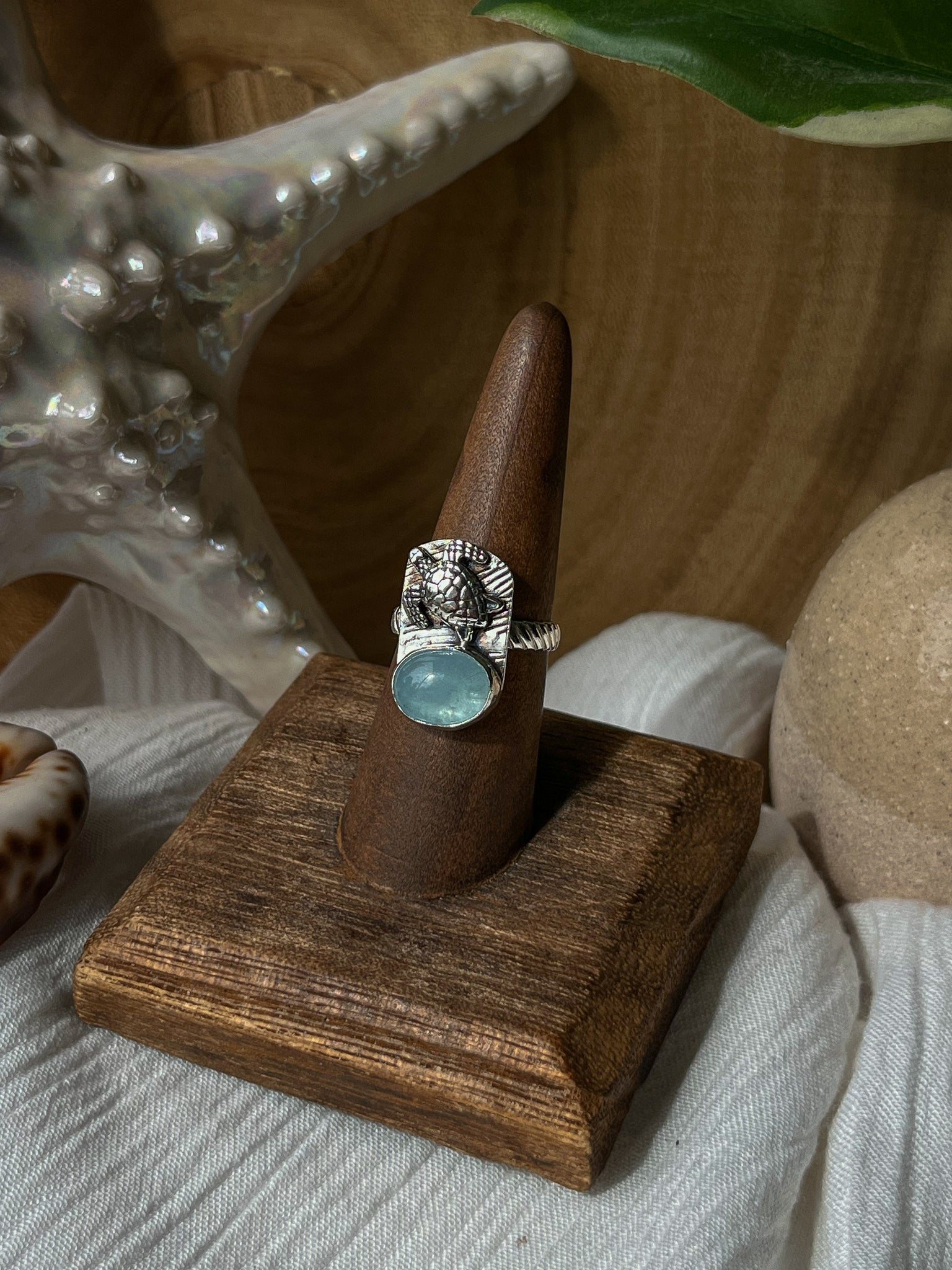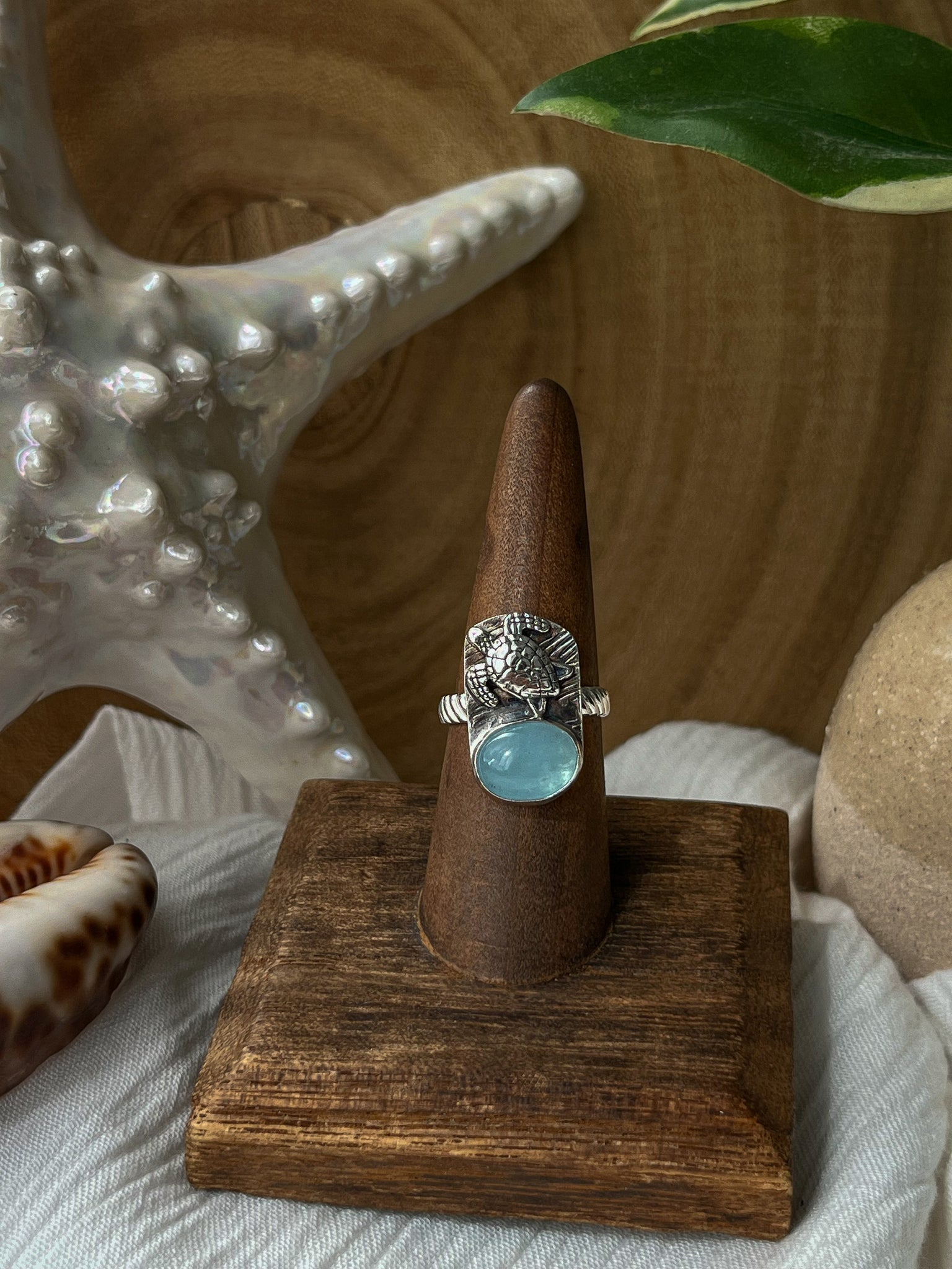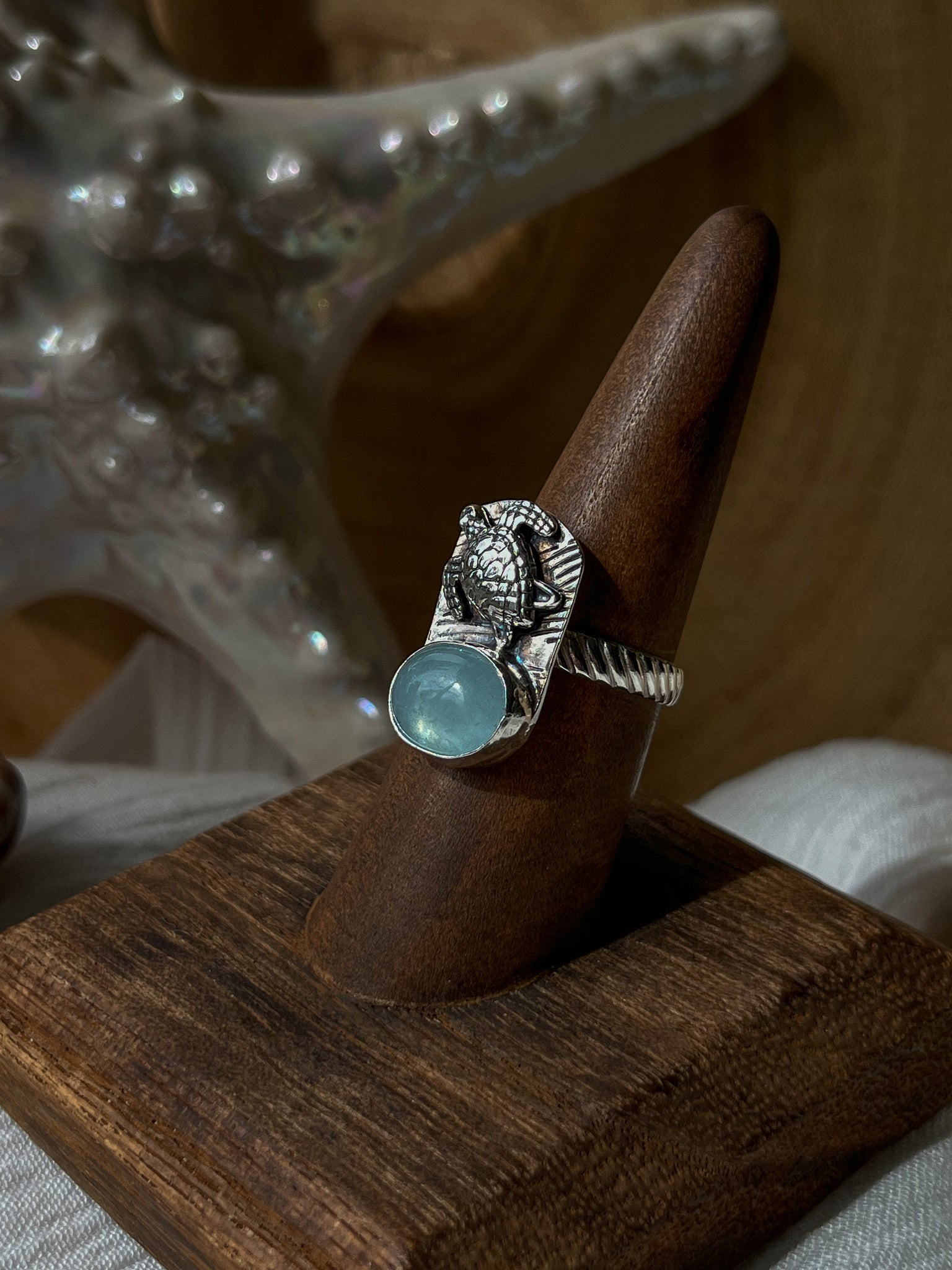 Bring the beauty of the sea with you wherever you go with our Turtle Bay x Aquamarine Size 7.5 ring. Featuring a high grade oval aquamarine stone, set below a 3D sea turtle beached on the shores, this ring is the perfect way to embrace summer all year round.